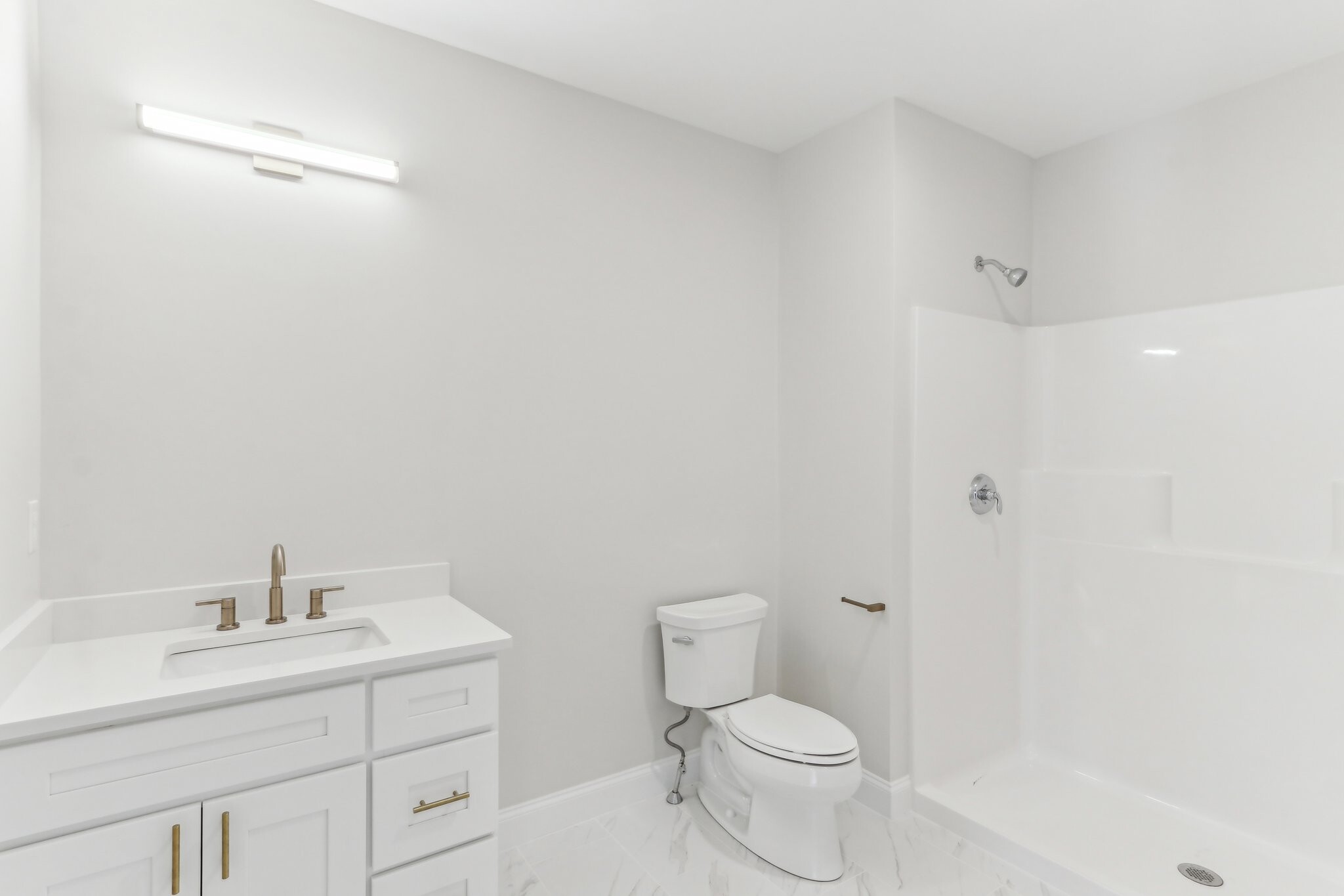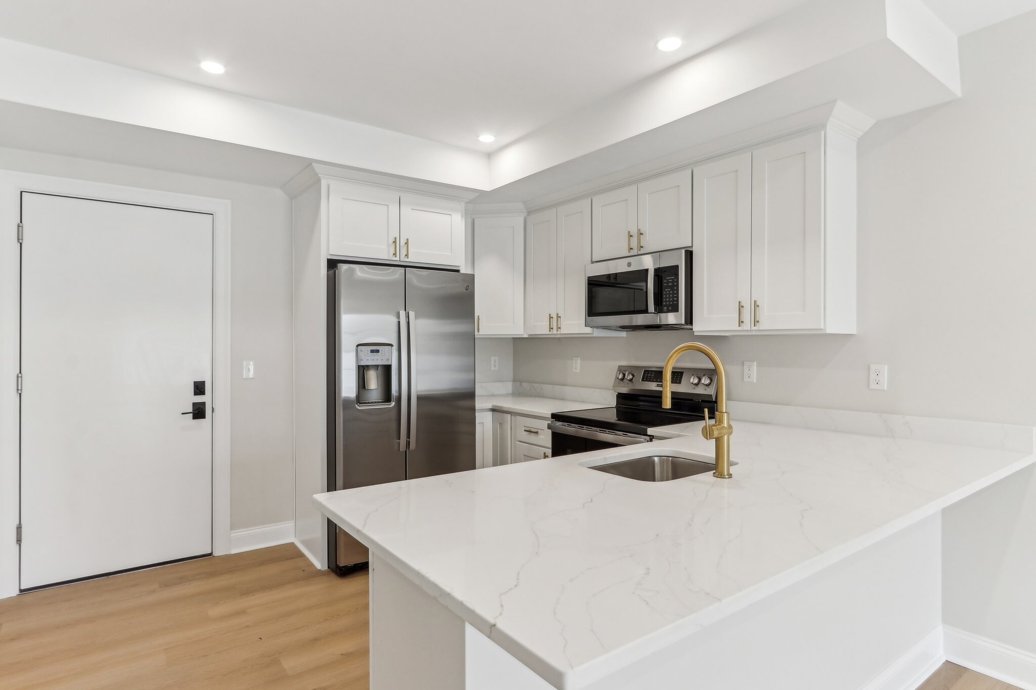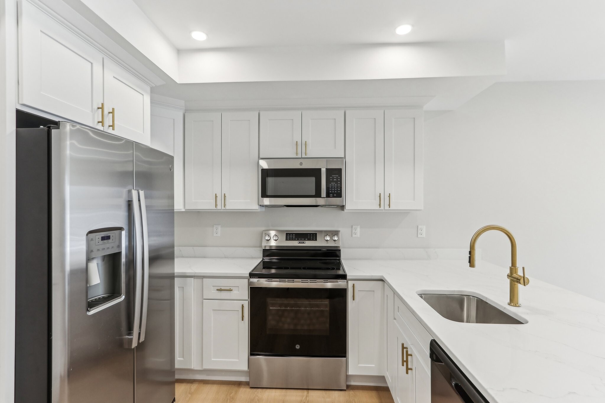 • Quartz countertops in kitchen and bathrooms