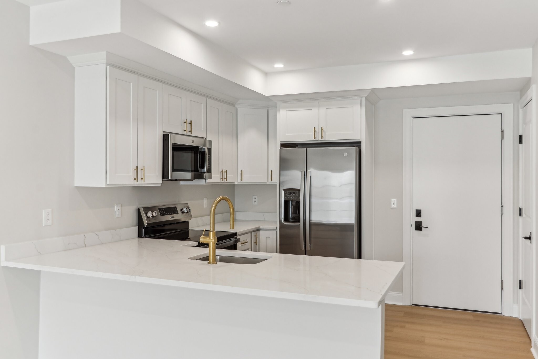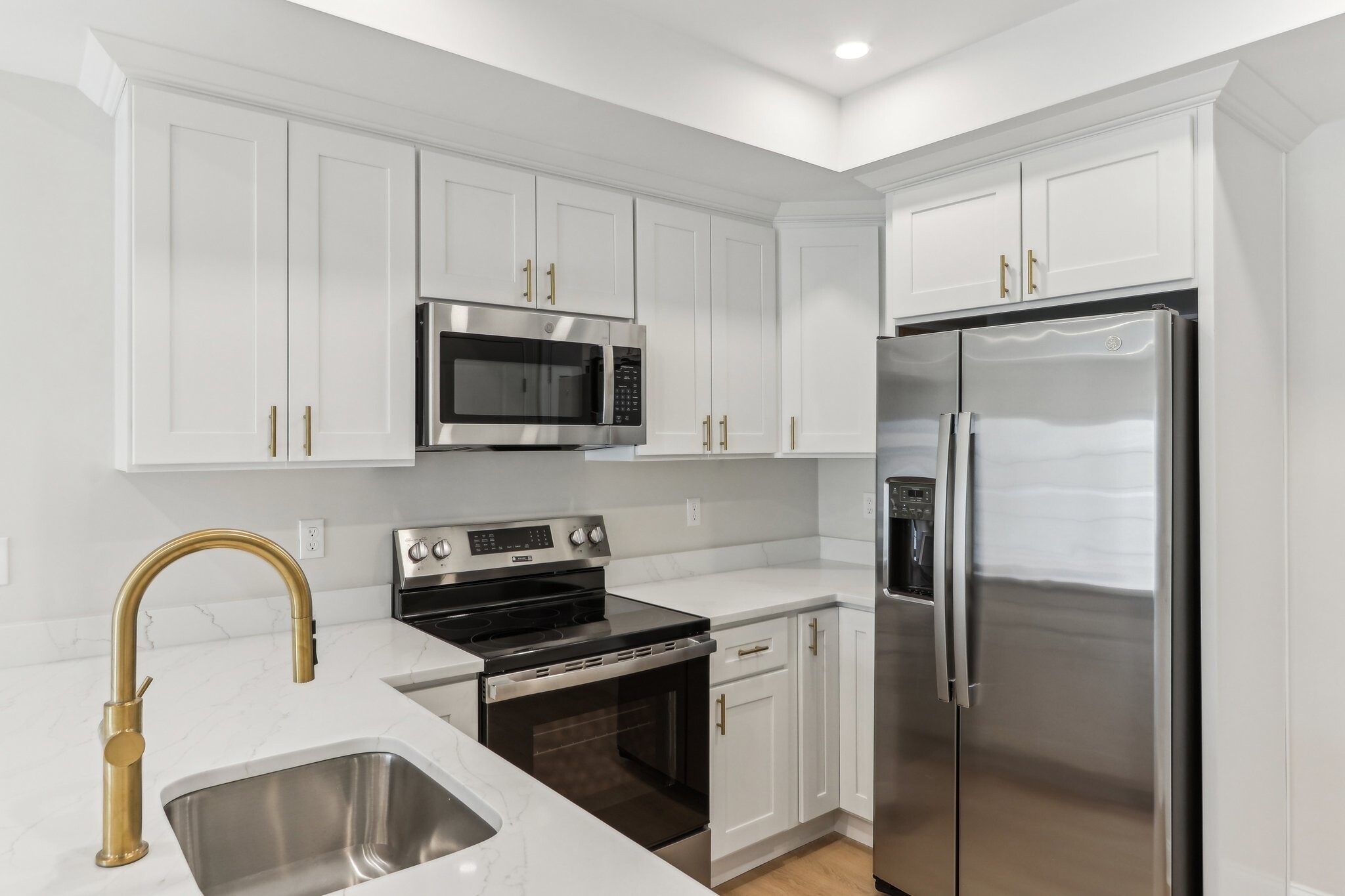• Quartz countertops in kitchen and bathrooms